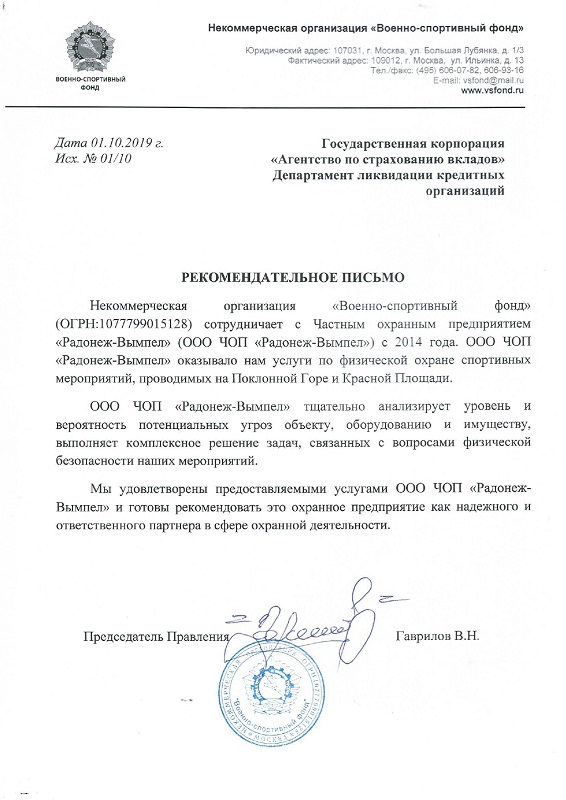 Частное охранное предприятие «Радонеж-Вымпел» оказывает широкий спектр охранных услуг, соответствующих законам и требованиям РФ. С полной уверенностью Вы можете доверить нам охрану имущества, груза или промышленного предприятия.